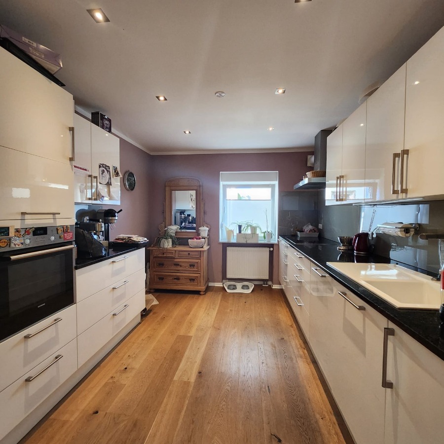 Im Erdgeschoss erwarten Sie helle, großzügige Räume mit Echtholzböden, LED-Deckenspots und einer modernen Raumgestaltung. Der Wohnbereich besticht durch eine Deckenhöhe von 2,55 m, was ein angenehmes Raumgefühl schafft. Die zeitlose Markeneinbauküche fügt sich harmonisch in den Wohn- und Essbereich ein – perfekt für Genießer und Familien.
